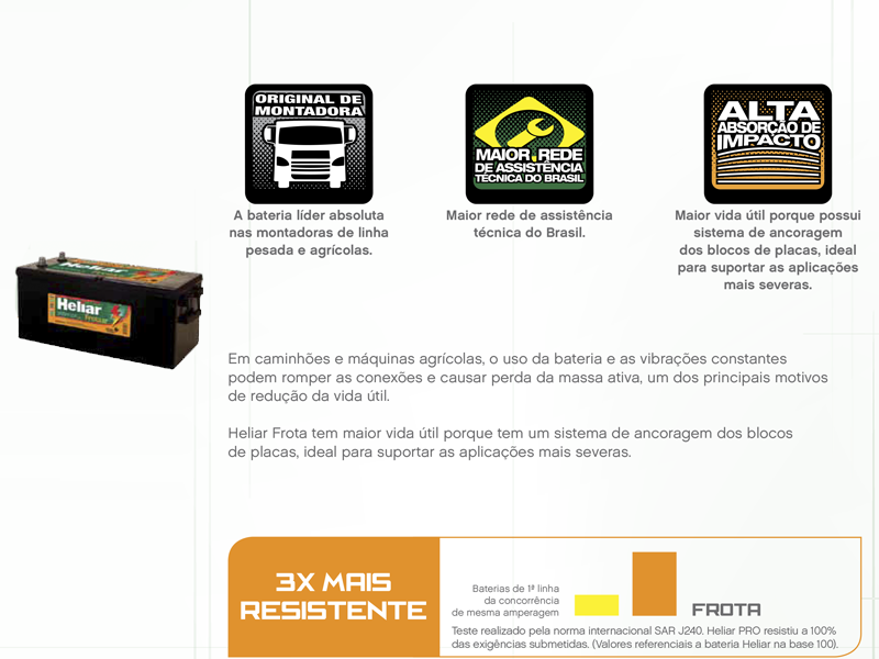 No Brasil, a Heliar tem a mais avançada tecnologia e atende a todas as exigências internacionais, e por isso as baterias Heliar estão presentes na maioria dos carros, motos e veículos pesados do Brasil.